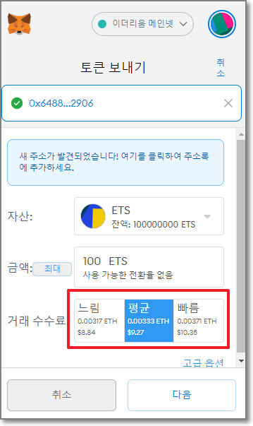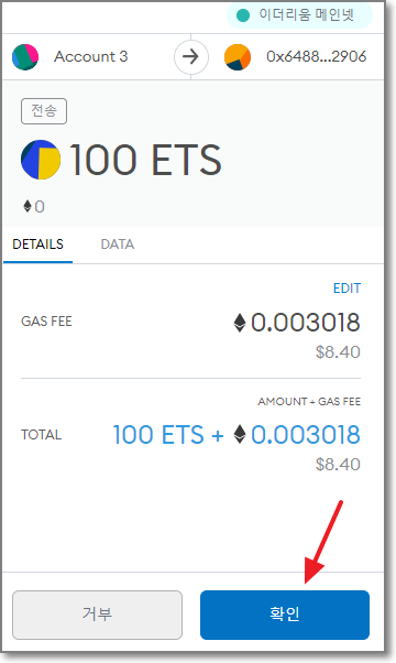 취소했다가 다시 보내기를 몇 번 해보다가 15000원까지 오르기도 했고 9천 원까지 내리기도 해서 보내보았습니다. 100 ETS를 보내기 했는데요. 수수료는 8.4달러 나왔고 "확인"을 누릅니다.