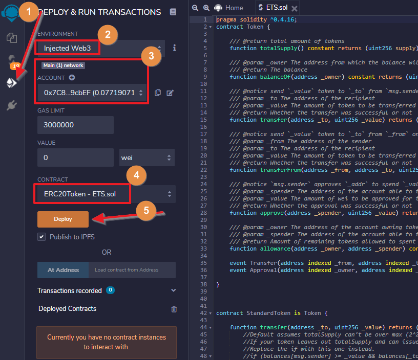 맨 위부터 첫 번째 왼쪽 메뉴 중에 이더리움처럼 생긴 아이콘을 누르고 맨 위에 있는 항목을 Injected Web3로 바꾼 후에 메인넷 주소랑 맞는지 확인하고 contract는 ERC20Token - ETS.sol을 체크하고 Deploy를 누릅니다.