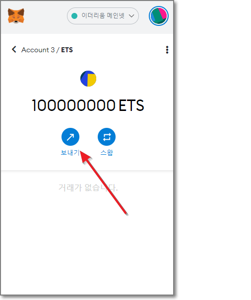 이제 코인을 만든 지갑으로 가서 ETS 코인으로 들어간 다음 "보내기"를 누르고 수신인에 상대방의 주소를 붙여 넣기 합니다.