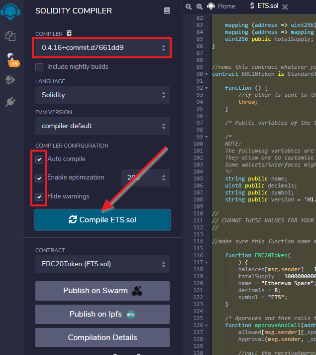 맨 위에 있는 COMPILER를 0.4.16으로 바꾸고 아래쪽에 있는 세 군데 모두 체크한 후 Compile ETS.sol을 누릅니다.