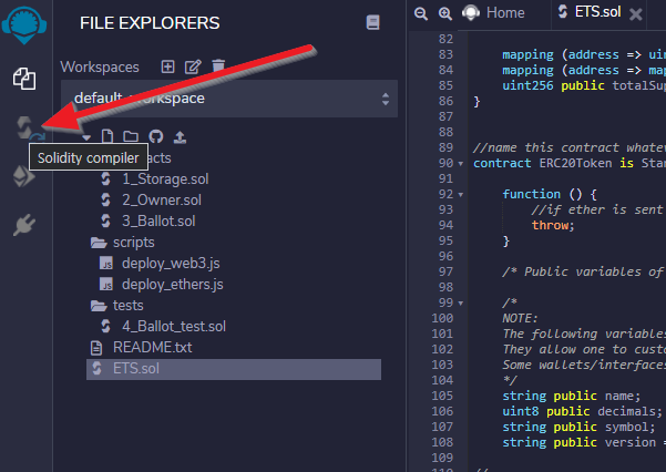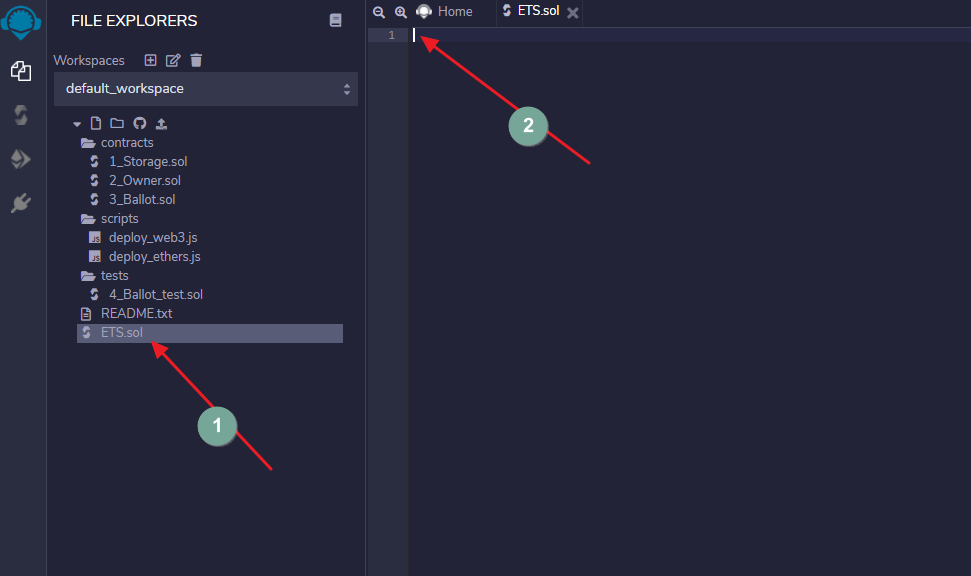 이제 위에서 다운로드해서 연 소스코드를 복사해서 붙여넣으면 되는데요. 아래 그림처럼 ETS.sol을 클릭하고 오른쪽에 빈 공간에서 1 옆에 있는 커서를 클릭하고 복사한 내용을 붙여 넣으세요.