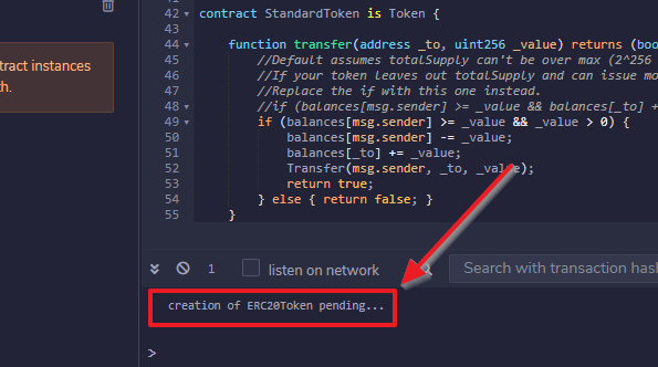 다시 리믹스로 가서 보면 "creating of ERC20Token pending..."이라는 말이 쓰여있는데요. 펜딩(pending)은 진행 중이라고 이해하시면 됩니다. 코인 제작 역시 네트워크 상황에 따라서 시간이 차이가 나니 인내심을 가지고 기다려주세요. 많이 기다리면 5분 이상 기다려야 할 때도 있습니다.