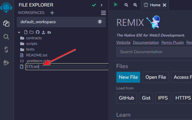 이름을 정하고 뒤에 "쩜 sol"을 붙이면 됩니다. 여기서는 "이더리움 스페이스"를 뜻하는 ETS.sol이라고 쓰겠습니다.