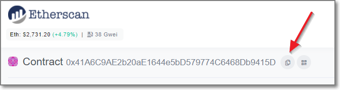 그럼 이번에는 메타마스크에 이 코인을 등록을 해보겠습니다. 컨트랙트 주소가 제일 중요한데요. 이 주소를 아래처럼 생긴 아이콘을 눌러서 복사합니다. 0x41A6C9AE2b20aE1644e5bD579774C6468Db9415D 와 같은 값이 나옵니다.