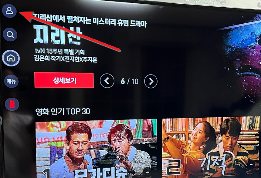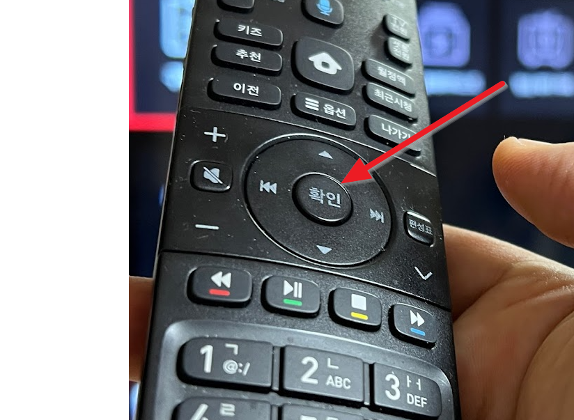 화면의 왼쪽에 있는 아이콘에서 맨위에 있는 사람 모양의 아이콘까지 리모컨의 방향 버튼을 이용해서 천천히 올라가서 "확인"을 꾹 누릅니다.