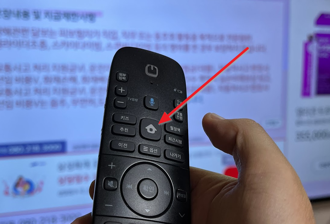 올레티비를 켜고 리모컨에서 가운데 있는 집 모양의 "홈"버튼을 누릅니다.