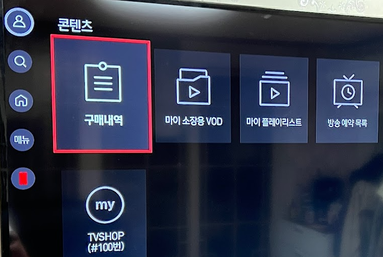 "콘텐츠"에 "구매내역"이라는 곳에 빨간색 박스로 선택을 하고 리모컨의 "확인"을 누릅니다.