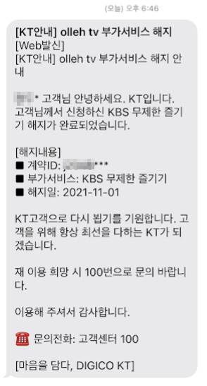 제대로 해지가 되면 올레티비 명의자 휴대폰으로 아래와 같은 메시지가 오게 됩니다.