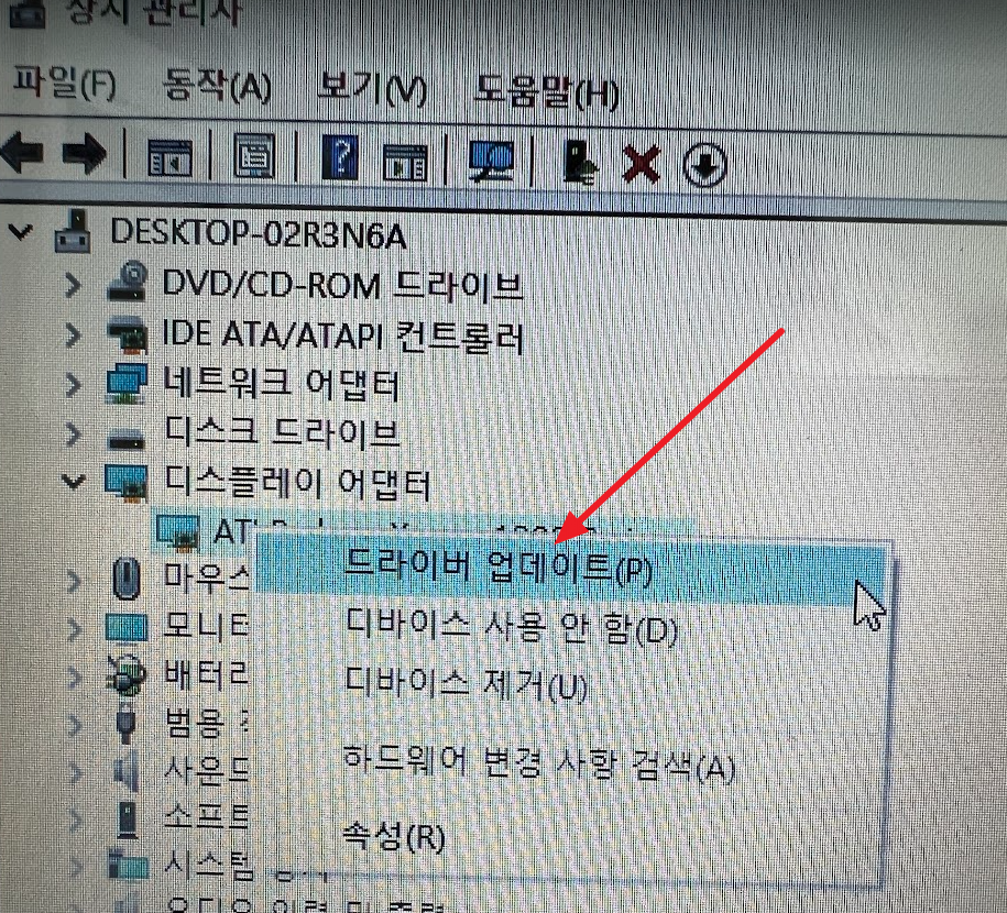 디스플레이 어댑터 밑에 "드라이버 업데이트"를 누릅니다.