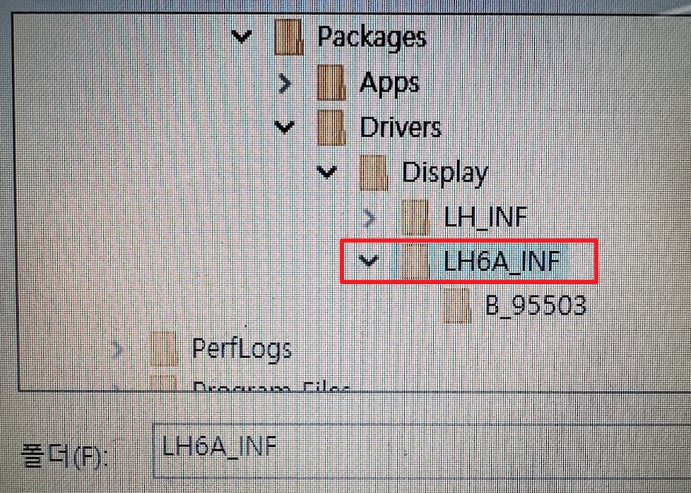 파일 경로는 C:\ATI\Support\10-02_legacy_vista32-64-dd-ccc\ 밑에 Packages\Drivers\Display\LH_INF(32비트), LH6A_INF(64비트)에 드라이버가 있습니다. 여기까지 하나하나 찾아 내려왔으면 폴더 선택 후 확인을 눌러서 경로를 지정합니다.