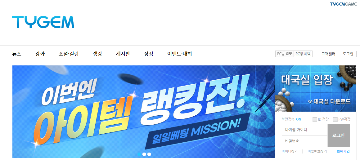 위에 있는 타이젬 바둑 홈페이지에 접속하면 깔금한 외관과 더불어 오른쪽에 로그인 창을 확인할 수 있는데요. 아이디가 있는 분이라면 바로 대국실 입장 다운로드를 클릭하여 설치를 진행할 수 있습니다.