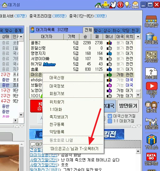 대기자목록에서 오목을 신청할 회원을 선택 후 마우스 오른쪽 버튼으로 클릭하여 오목을 하실 수 있습니다.