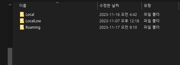 AppData폴더를 열면 아래처럼 세개의 폴더가 있는데요. 이번에는 각각 폴더에 대해서 잠깐 알아보겠습니다.