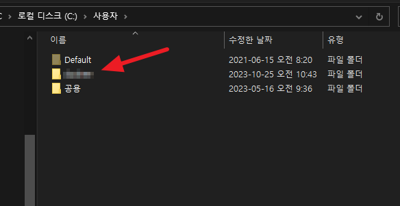 대부분의 PC에서 아래처럼 3개의 폴더가 나오는데요. 그 중에서 Default와 공용을 제외한 개인적인 이름으로 만들어져있는 폴더로 들어갑니다.