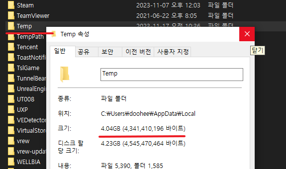 그래서 Local 폴더 아래 있는 Temp만 지웠습니다.